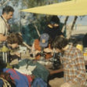 Professor Oglesby and students sit at tables to exam specimens under microscopes at Mecca Beach on the Salton Sea.