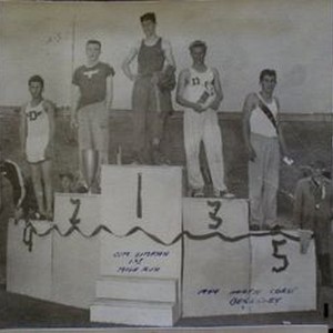 Photo--Black and white: Analy High School track team 1949--North Coast Championship meet--Berkeley, CA. Four photos- Right to Left, top to bottom: (1) Jim Simpson, 1st place, Mile Run. (2) Wes Nott, tied 2nd place, Pole Vault. (3) Dave McNeill, 3rd place, Broad Jump. (4) Bill Scheidecker, 4th place 120 high hurdles.