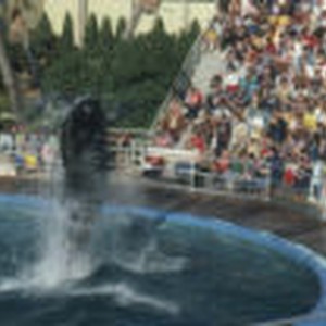 A pilot whale jumping in the air during a show at the Marineland amusement park.