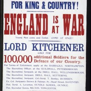 The call to arms. For King and country. England is at war. Young men come and enlist. Come at once. Lord Kitchener asks for 100,000 additional soldiers for the defence of our country