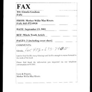 Willie Mae Rivers (Church of God in Christ. Women's Department), fax, 2001 September 13, to Glenda Goodson. [Description English/roman)]