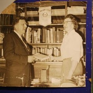 Poster photo of Delbert (Deb) Triggs, president of Sebastopol Rotary, presenting a shelf of books to Helen Pedroia, Librarian of Analy Union High School, 1950s