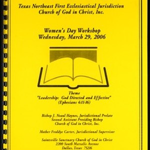 Women's day program, "Leadership: God directed and effective", Ministers and workers convocation, Texas northeast, Saintsville Sanctuary Church of God in Christ, Dallas, Texas, 2006 March 29. Includes handwritten notes. [Description English/roman)]