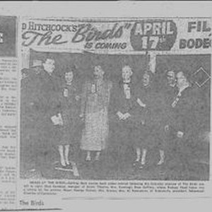 Photo newspaper clipping, black and white: Newspaper clipping of "The Birds" movie opening at the Analy Theatre in Sebastopol April 17, 1963. The people identified are L-R: Dick Gambogi, manager of Analy Theatre, Mrs. Gambogi, Rose Gaffney, whose Bodega Head home was a setting for the picture: Mayor George Groves, Mrs. Groves, Mrs. Al Rabinovitz (partially visible behind her husband) and Al Rabinovitz, president, Sebastopol Chamber of Commerce. Rose Gaffney is further known for leading the opposition to Pacific Gas & Electric Company's attempt to build a nuclear power plant at Bodega Head in the 1960s.