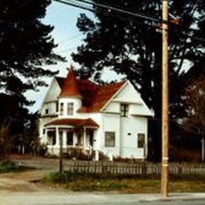 Slide, color transparency: The Baxter or Malm House at 876 Gravenstein Highway South in 1975. A Queen Anne Shingle built about 1892 was remodeled in 1980 to office space. Through the years it was also the home of Cuthbert E. Malm, a local dentist and a restaurant called Chateau Margot in the 1970s.
