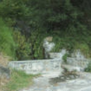 A small stone wall sits at the base of a mountain surrounded by foliage and trees.