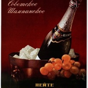 A poster advertising a "Sovetskoe shampanskoe" sparkling wine. Captions read, "Sovetskoe shampanskoe. Peite Sovetskoe shampanskoe, luchshee vinogradnoe vino / Советское шампанское. Пейте Советское шампанское, лучшее виноградное вино", meaning, "Sovetskoe shapmanskoe. Drink the Sovetskoe shampanskoe, the best grape wine". [Description English/roman)]