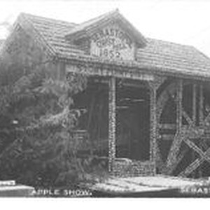 Postcard photo, black and white: A 1911 Gravenstein Apple Show exhibit of the Sebastopol Grist Mill made by the Stony Point District. The mill is made of dried and whole apples.