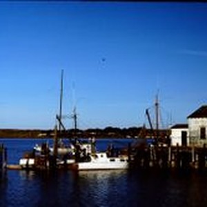 Slide, color transparency: Bodega Bay pier with boat. 1975