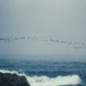 Numerous white-winged ducks flying over the Mendocino coastline in formation during the autumn season.