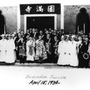 Photo, black and white: Dedication of Enmanji Buddhist Temple in Sebastopol on April 15, 1934 located at the corner of Gravenstein Highway South and Elphick Road. A gathering of church and local Japanese dignitaries and local residents on the front steps of the Temple. Eight young men are wearing white robes and caps along with other older men in sashes and robes. A Kanji banner (Chinese characters used in Japanese writing) is seen above the doorway. Background: The unique Enmanji Buddhist Temple, originally built by the Manchurian Railroad Company for the Chicago World's Fair in 1933, faithfully represents a 12th century Kamakura-style Japanese temple. After the fair it was offered to the members of the Sonoma County Buddhist Temple and the structure was dismantled and shipped by rail to Sebastopol for reassembly. It was completed and dedicated on April 15, 1934 after being reconstructed without the use of nails by skilled local Japanese craftsmen.