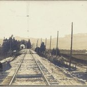 Photo--black and white: Petaluma & Santa Rosa electric tracks south from the Quarry, 1904. (Stoney Point Quarry)