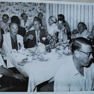 Photo--black and white: Sebastopol Lions Club scrapbook photo: Lions Club district meeting: Spencer Bisby (in dark suit, center) and Jack Robinson to his right. Circa 1963