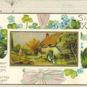 Postcard--colored picture: Caption: "Sincere Wishes." Violets and shamrocks surround picture of house in country. Handwritten message on back.