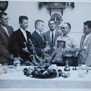 Photo--black and white: Sebastopol Lions Club scrapbook photo: Lions football awards dinner: L-R: Wally Barnard-coach, unknown, Jeff Nelson, unknown, Al Rabinovitz and Ed Gonsalves. Circa 1955. Photo by K-D Studio.