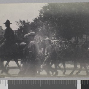US servicemen on horseback and walking in the Plaza de Armas in Veracruz Mexico.