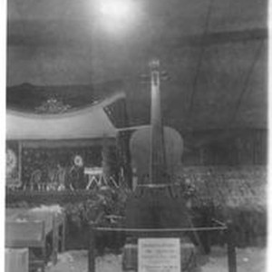 Photo--black and white: Gravenstein Apple Show display of The World's Largest Fiddle made by the Bridgeford Planning Mill of Sebastopol in 1928 or 1929. The sign below the fiddle: "Originated, designed and constructed by the Gravenstein Apple Show Committee Sebastopol Post No. 39 American Legion." Behind the fiddle are apple displays and a stage step up for a band or orchestra. The fiddle was shown in the Sebastopol Gravenstein Apple Fair in 1929(?) and also at the Chicago World's Fair in 1933.
