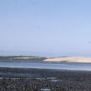 Forster's terns flying and feeding in water. Sand dunes in background.