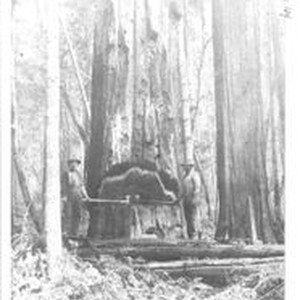 Photo--black and white: Photo identified by R.S.Sturgeon as "Logging 44." Falling on the Gualala River (Sonoma County) California. L to R: Steve Tisconi and Bill Brain. 1900 Handwritten on verso by Ralph Sturgeon- "The larger trees to fall--welded two falling saws together. No shown in this picture--Vance Randal. Vance had a partner who Walter Brain knew well but can't or couldn't recall his name. Many, many of the larger logs that did go t the sawmills, they used augers, bored holes (sometimes light tubing driven into holes to make a cleaner no slab split.) Clay tamped tight lower end--then black powder, fuses and clay. (I, Ralph Sturgeon here at Sturgeon's Mill, 2150 Green Hill Rd. Sebastopol, 95472,) always used two fuses (the kind one lights a match to) so in case one went out, the other took. One's judgment as to where goes the hold, and how deep, the load of powder, were the things to judge and know. Usually the hole closer to butt end of log. I never used the "pipe" splitter that went into end of the log."