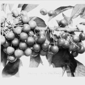 Photo--black and white: Identification of Luther Burbank cherry hybrid from the Gold Ridge Experiment Farm. Cherry clusters on branch labeled "Cherry--H-14 (South Giant).