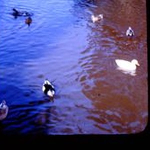 Slide, color transparency: Ducks in Ives Park pond, Sebastopol. about 1965.