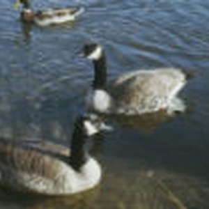 Close-up of two geese and a male duck wading in water at Glen Helen Regional Park.