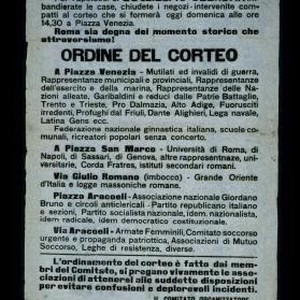 Cittadini. Per l'apoteosi di Guglielmo Oberdan imbandierate le case, chiudete i neggozi, intervenite compatti al corteo che si formera oggi domenica ... L'ordinamento del corteo e fatto dai membri del Comitato, si pregano vivamente le associazioni di attenersi alle suddette disposizioni per evitare confusioni e deplorevoli incidenti