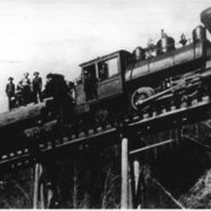 Photo--black and white: Western Redwood Lumber Company train crossing at Russian Gulch near Jenner, 1907. Train loaded with cut trees. Frank Lambert, Henry Lambert and several other unidentified. The narrow gauge line crossing the Russian Gulch parra