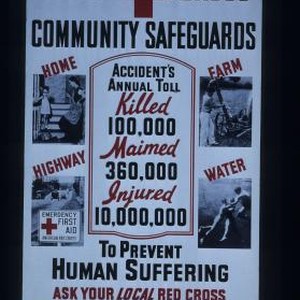 Red Cross community safeguards. Accident's annual toll killed 100,000, maimed 360,000, injured 10,000,000. To prevent human suffering, ask your local Red Cross