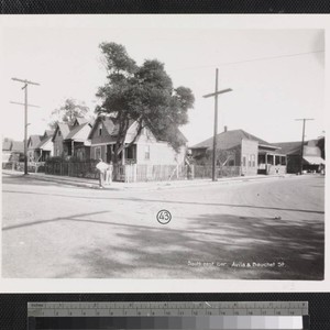View of houses with fenced-in yards and trees, as well as two boys standing at center and a business at the far right viewed from the corner of Avila Street and Bauchet Street near Old Chinatown in Los Angeles. Title transcribed from photograph. Two copies of this photograph. This copy has a "43" inside a circle stamped in the lower center of the photograph.