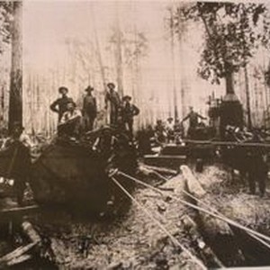 Photo--black and white: Donkey steam engine with spools and cables pulling logs out of woods. Mendocino County. Logging crew in center.