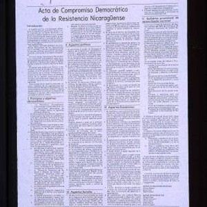 Acta de compromiso democratico de la resistencia nicaraguense. Introduccion: ... I. Principios y objetivos democraticos: ... II. Aspecos politicos: ... III. Aspectos sociales: ... IV. Aspectos economicos: ... V. Gobierno provisional de reconciliacion nacional: ... Unidad Nicaraguense Opositora (Alfonso Robelo, Arturo Cruz, Adolfo Calero). Bloque Opositor del Sur (Alfredo Cesar, Adolfo Chamorro, Alvaro Jerez, Edgar Macias, Bayardo Lopez)