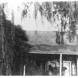 Photo--black and white: The back of an adobe house on the O'Farrell Ranch also known as Analy Ranch owned by Jasper O'Farrell in Freestone, CA. The roof is partially covered in vines and the porch has a barrel, work bench and various tools. Eucalyptus tree branches seen in foreground.