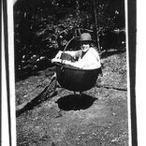 Photo--black and white: Unidentified girl in iron rendering vat handing on chain--circa 1920.