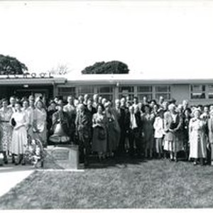Photo--black and white: 100th Centennial of Oak Grove School, Graton, CA. 1954. All former pupils are seen in front of school. The man at the right, standing next to a woman is Bill Hotel, local apple grower.