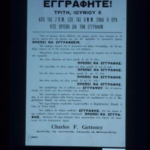 Register! Tuesday, June 5 ... All males who on the above date have arrived at their twenty-first birthday ... Charles F. Gettemy, Director of the Military Enrolment for Massachusetts. [in Greek]