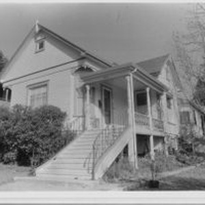 Photo, black and white: Sebastopol house at 495-97 North Main Street a Queen Anne Cottage built in 1900 in the Bonnardel Addition. House photographed in 1993 by Evelyn McClure for her book "Sebastopol, California : History, Homes and People."