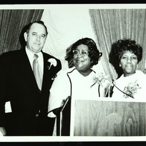 Photograph of a group of 10 people at the podium, Church of God in Christ, Texas, [s.d.]. Included are Mabel Thomson, Julia Scott Reed, Sweetie Jordan. [Description English/roman)]