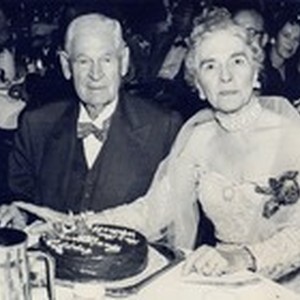 Portrait of William P. Whitsett and his wife Ida at anniversary party. Cake in front of them says happy anniversary.
