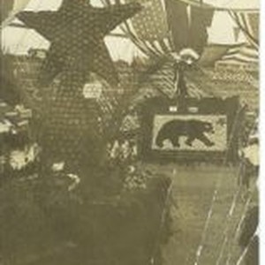 Postcard--black and white photo -Gravenstein Apple Show 1910--Apple displays in foreground Vine Hill, with star made of whole and dried apples. Sign states "Star of Vine Hill" Display in background Bear Flag. Far background sign "Stony Point District."