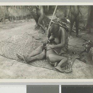 An indigenous woman sits on straw mat holding a small child with its head in her lap. She cuts his hair with a coconut shell. Other women stand in background. Title transcribed from envelope. Date devised by cataloger. . Verso of photo reads: "Cutting hair with coconut shell - Lua Nua Lord Howe of Solomons."