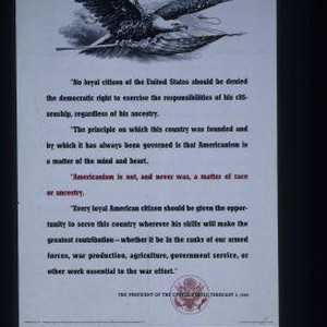 "No loyal citizen of the United States should be denied the democratic right to exercise the responsibilities of his citizenship, regardless of his ancestry ... Americanism is not, and never was, a matter of race or ancestry. Every loyal American citizen should be given the opportunity to serve this country wherever his skills will make the greatest contribution ... " The President of the United States, February 3, 1943