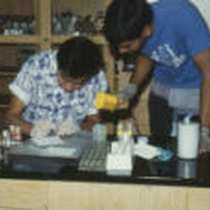 Mark Ngcyeu and Madhu Karunchra working together on an lab experiment.