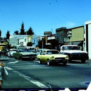 Slide, color transparency: Street scene of Main Street Sebastopol circa 1977. Medico Drugs is seen.