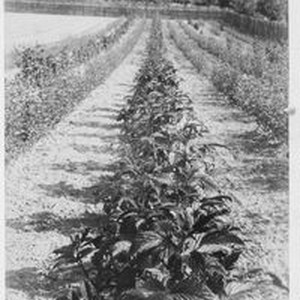 Photo, black and white: Luther Burbank's Gold Ridge Experiment Farm in Sebastopol with rows of plants possibly amaranths. A wooden fence is in the background and a orchard of trees beyond.