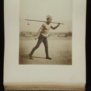 Image / Portrait of a man walking with a pole over his shoulder