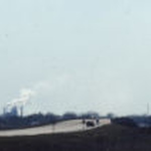 Automobiles drive over bridge as plumes of smoke fill the background sky.