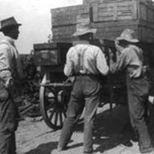 Photo--Black and white: The Garbo orchard, three men work on a horse drawn wagon full of fruit boxes--possibly apples or berries, about 1910. The Garbro Orchard was located at Vine Hill Road and River Road area. The Garbro Orchard was operated by brothers A.M. and J.M. Garcia.
