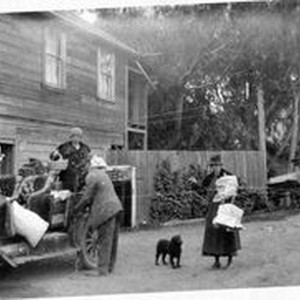 The Riddell family loading a vintage car in front of the Bodega Bay Store. In the car is daughter Blanche Riddell and her father F. J. and mother Eloise Riddell. Circa 1918.