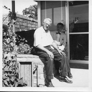 Photo--Black and white: Oscar A. Hallberg sits outside the O. A. Hallberg & Sons business office at 2999 Bowen Street in Graton.